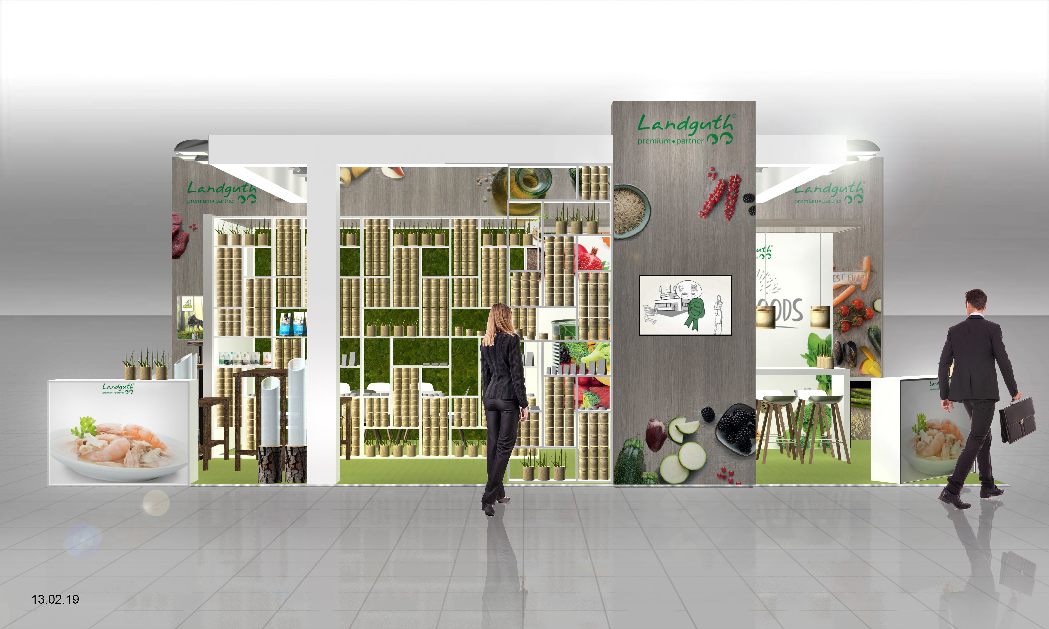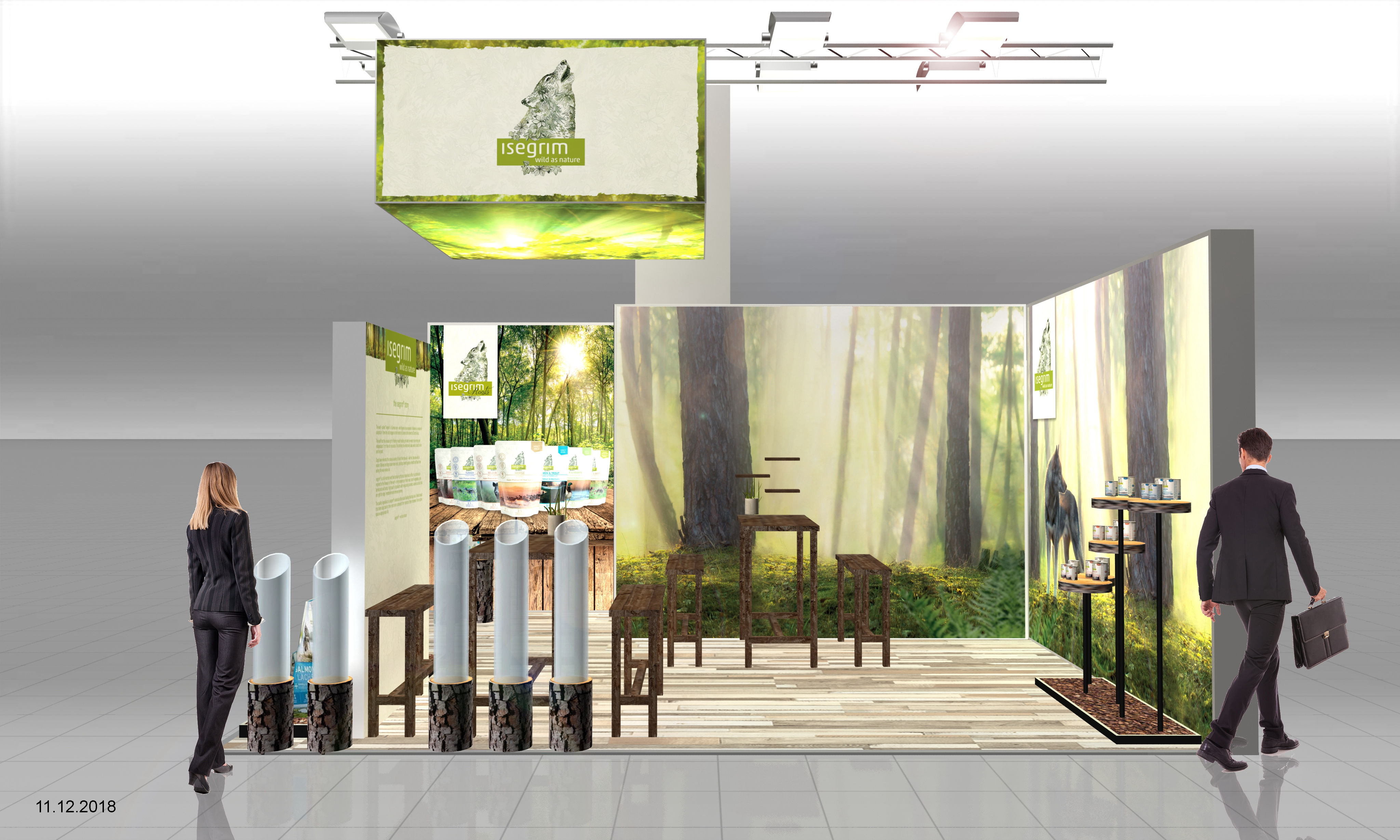 Eine Mooswand und grossflächig hinterleuchtete Wände bringen die Natur auf den Messestand.